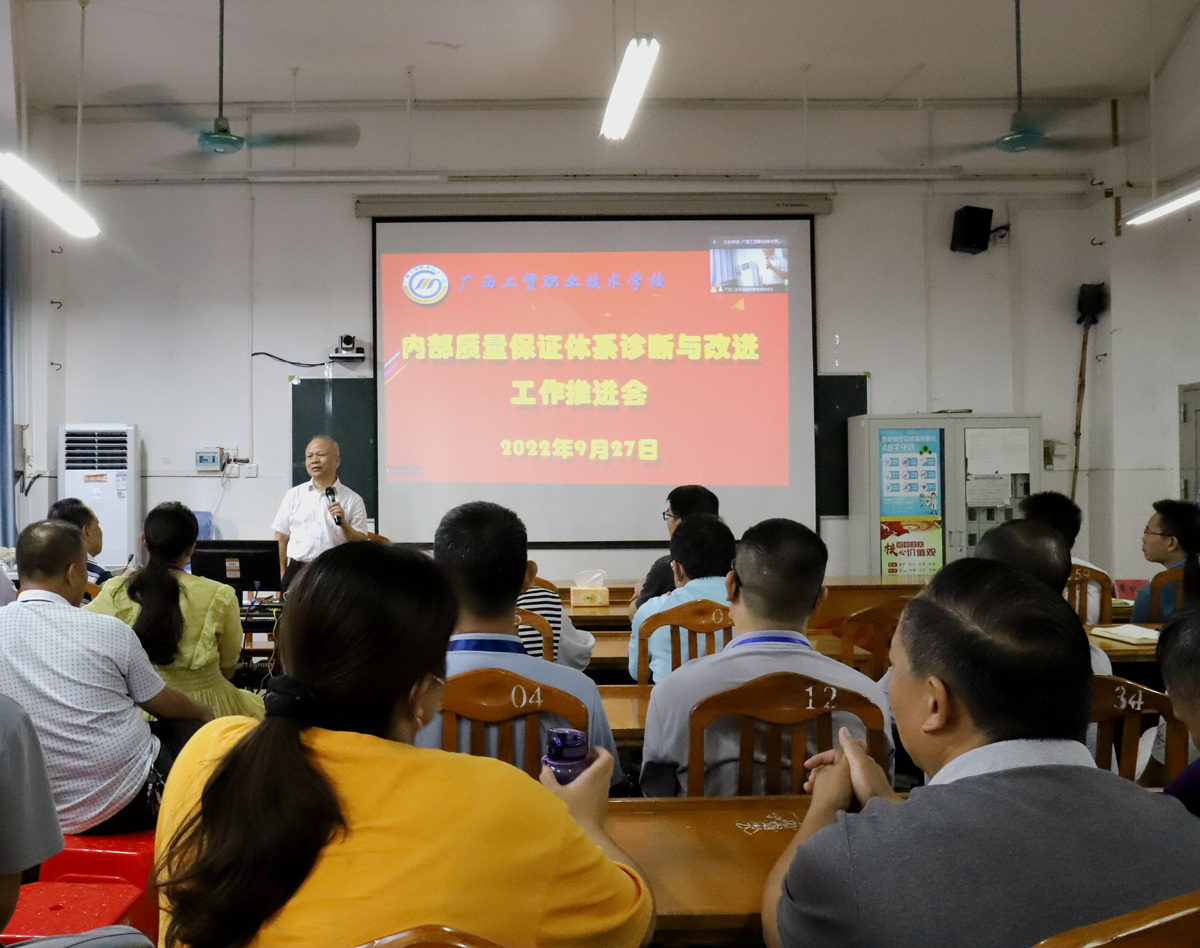 9月27日下午,我校在尚德楼五楼会议室召开2022年内部质量保证体系诊断与改进工作推进会,特邀河池市职业教育中心正高级讲师、副校长唐启焕到校对我校教师进行集中培训,助力我校诊改工作的有效推进,校长吴万东、副校长陈德校、副校长秦义宾及全体教职工参会,本次会议由质管办主任覃玖恒主持。