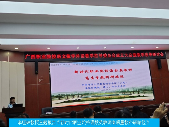 2024年11月1日—3日,我校罗岚方老师参加了在桂林举行,由广西职业院校语文数学外语教学指导委员会主办、广西师范大学职业技术师范学院承办、高等教育出版社协办的“广西职业院校语文数学外语教学指导委会成立大会暨教学改革研讨会”。来自区内高职院校、教辅机构和中职学校的85位专家、领导和委员参加了研讨会。广西师范大学党委常委、副校长、广西职业院校语文数学外语教学指导委员会主任委员黄文韬同志和广西教育研究院职业教育研究所所长李春鹏同志分别向大会致辞,广西职业院校语文数学外语教学指导委员会秘书长、广西师范大学职业技术师范学院副院长邓小华同志主持了会议。