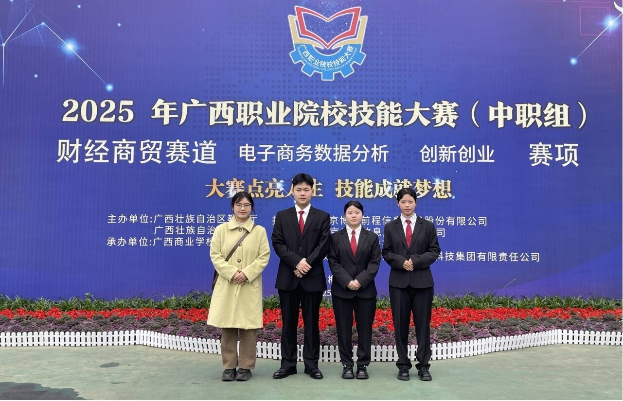 3月13—15日,三月繁花映暖阳,工贸职教育贤忙,无边光景一时新,技能学子绽瑞光,等闲识得东风面,万紫千红总是春。在2025年两会胜利召开的时代召唤下,在教育强国政策“组合拳”的指导下,2025年广西职业院校技能大赛中职组《电子商务数据分析》赛项比赛在广西商业学校成功举行。来自全区职业院校49支代表队同台竞技,我校计算机应用专业2302班学生吴帮俊、张晓菲、林艳桃组成的代表队以全区排名第三名的成绩荣获该赛项金奖,刷新我校在该赛项的历史最佳成绩。