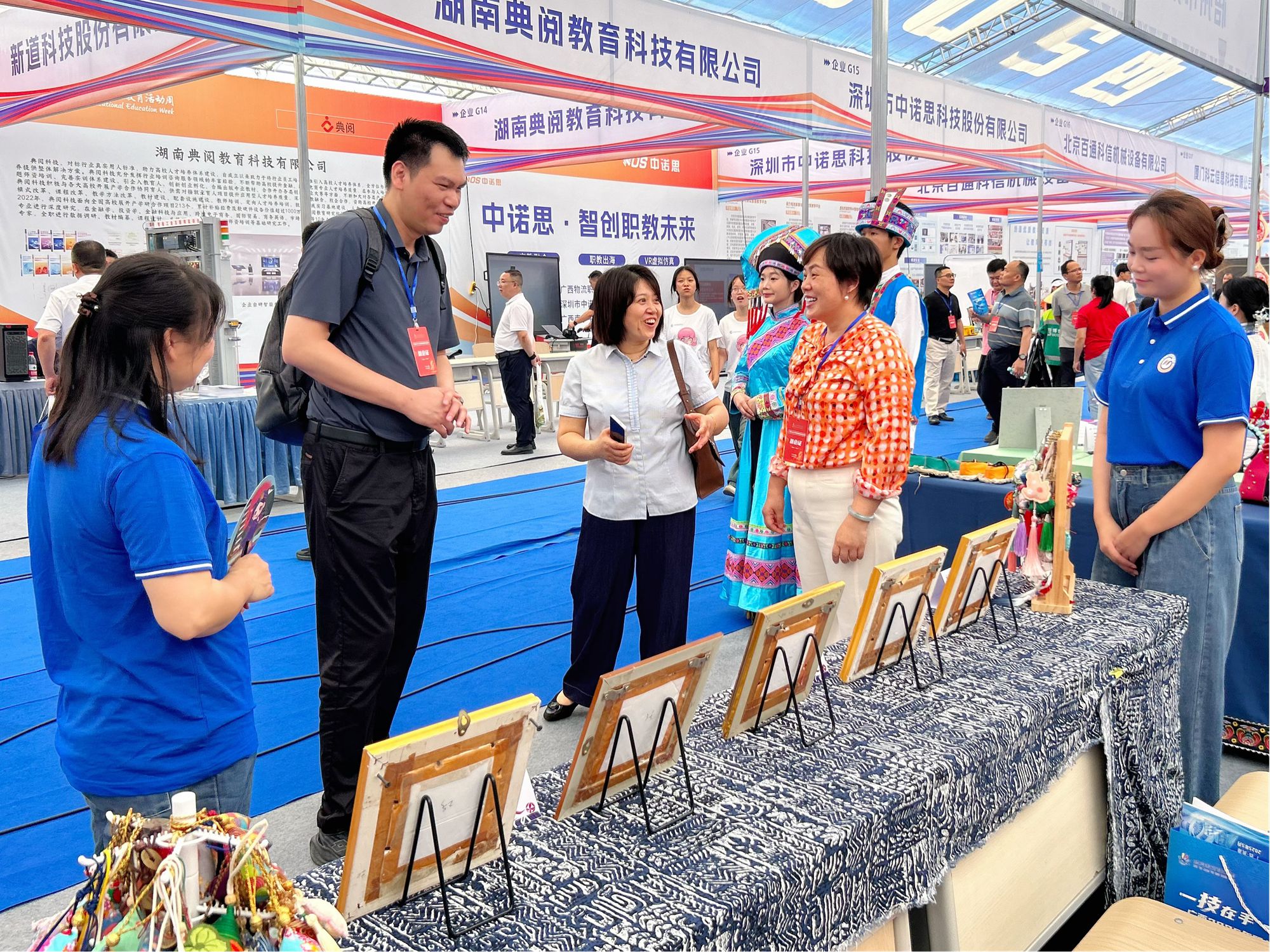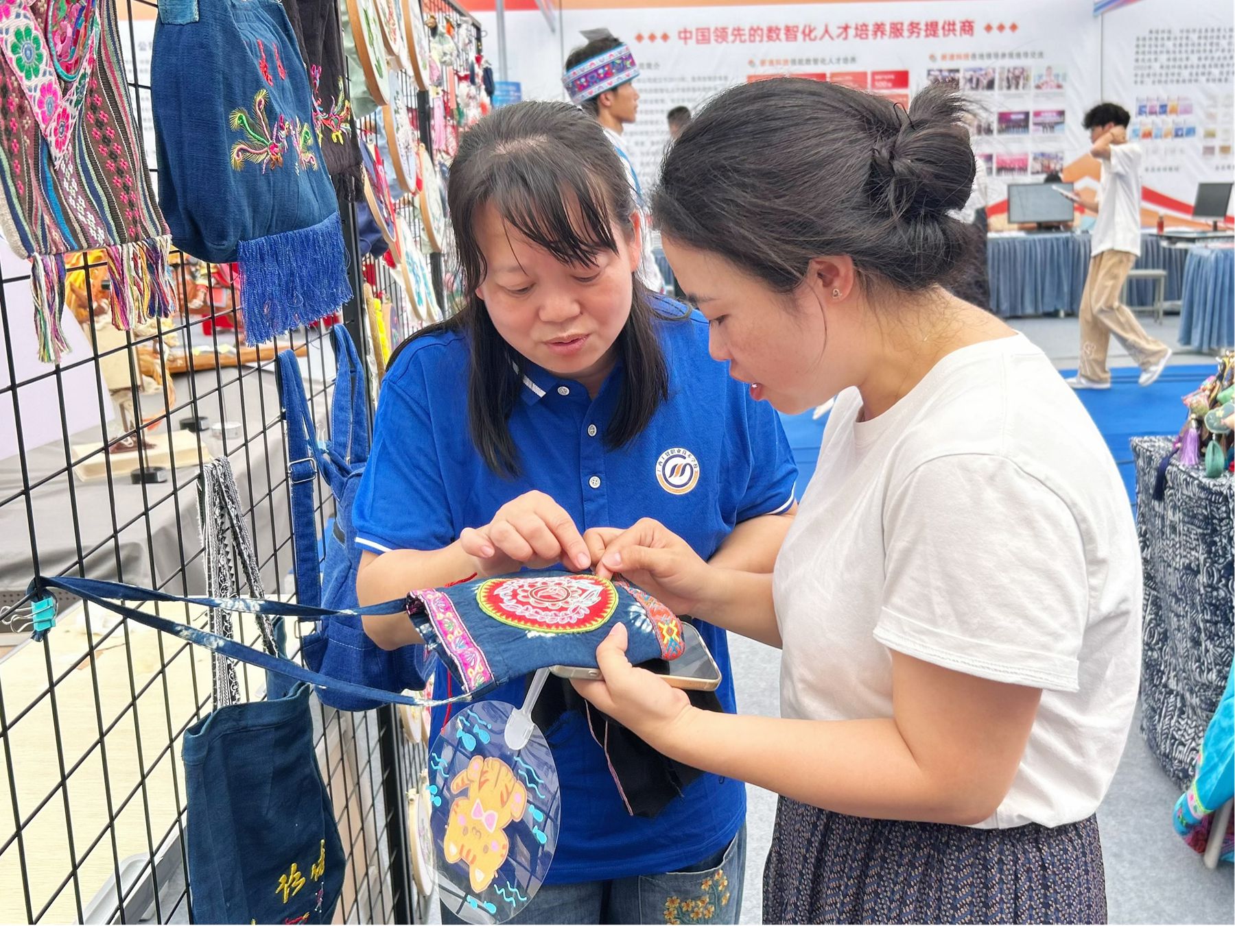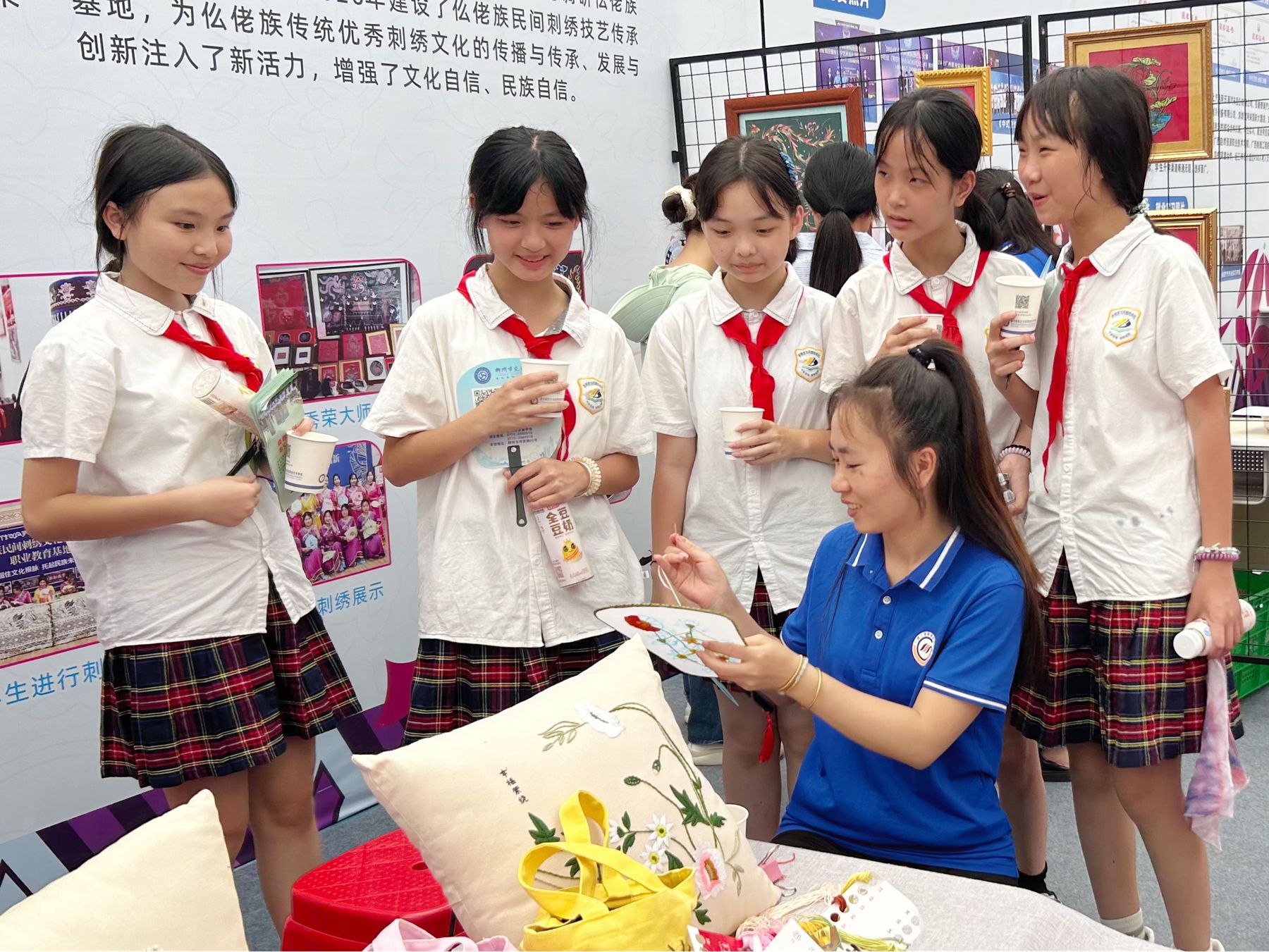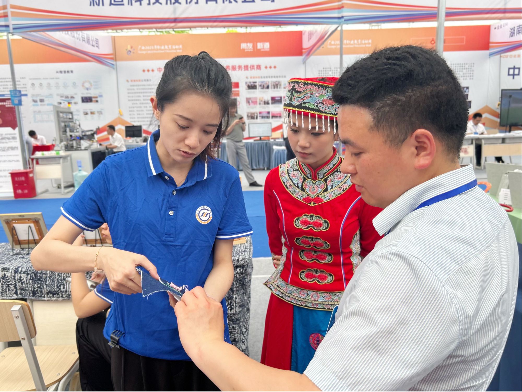 2025年5月15日,贵港市教育局组织中小学学生到职教活动周主题展示区域进行研学活动。仫佬族传统刺绣技艺体验活动吸引学生驻足观看和积极参与。