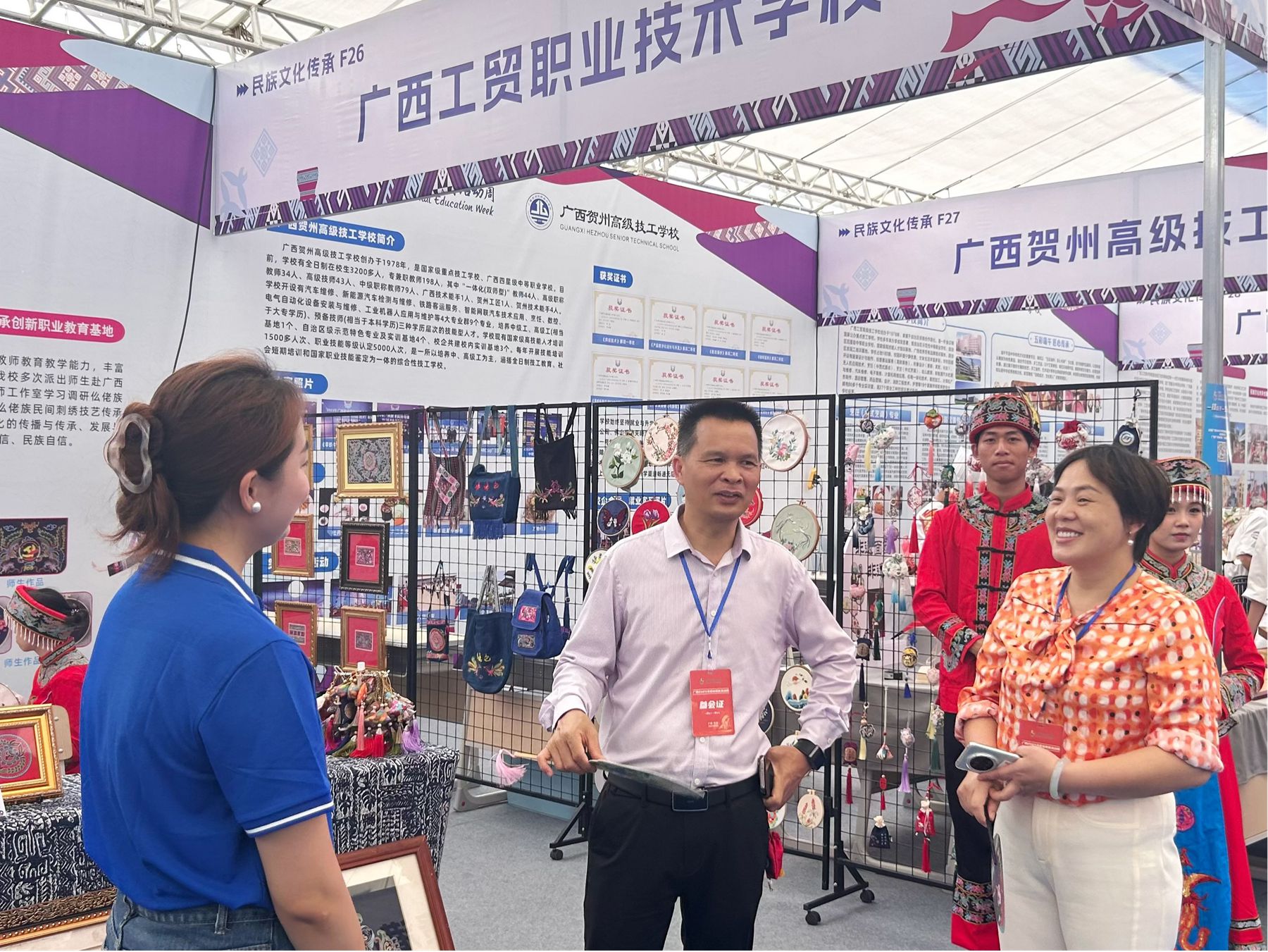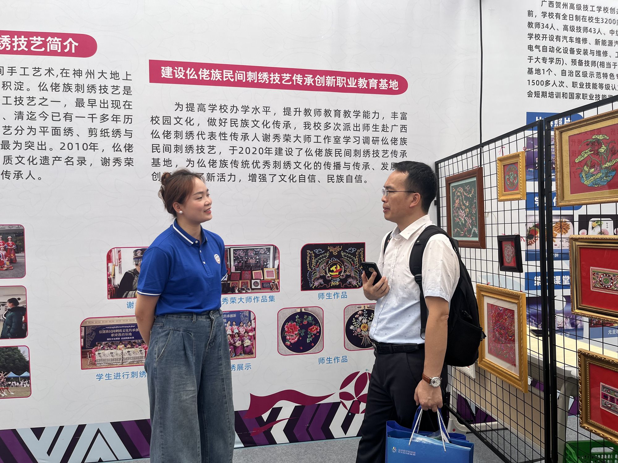 我校展区位于民族文化传承F区26号,主要展示仫佬族民间刺绣作品,学生现场展示刺绣技艺。展示期间吸引了各领导嘉宾、老师、学生驻足观赏、体验。
